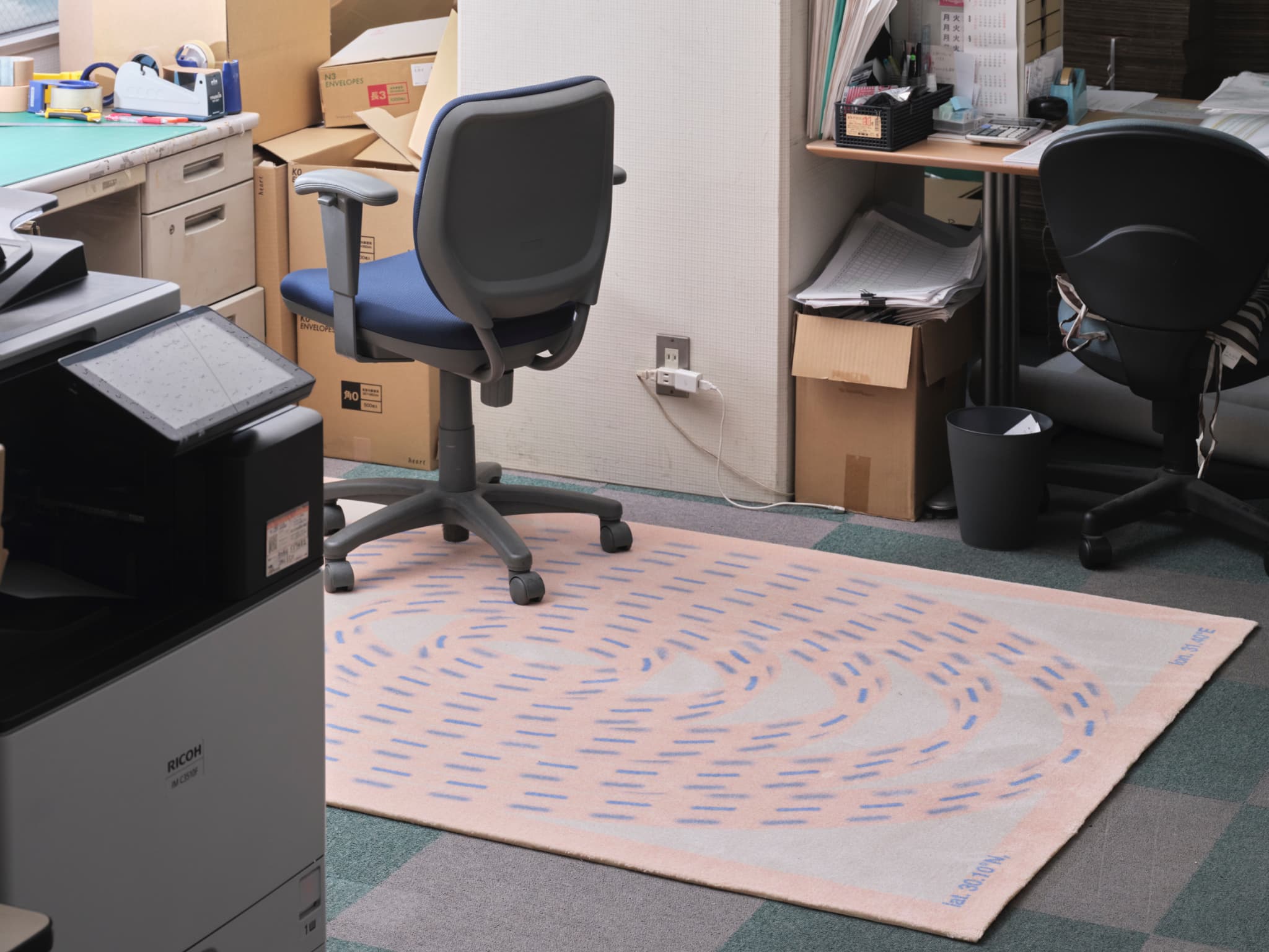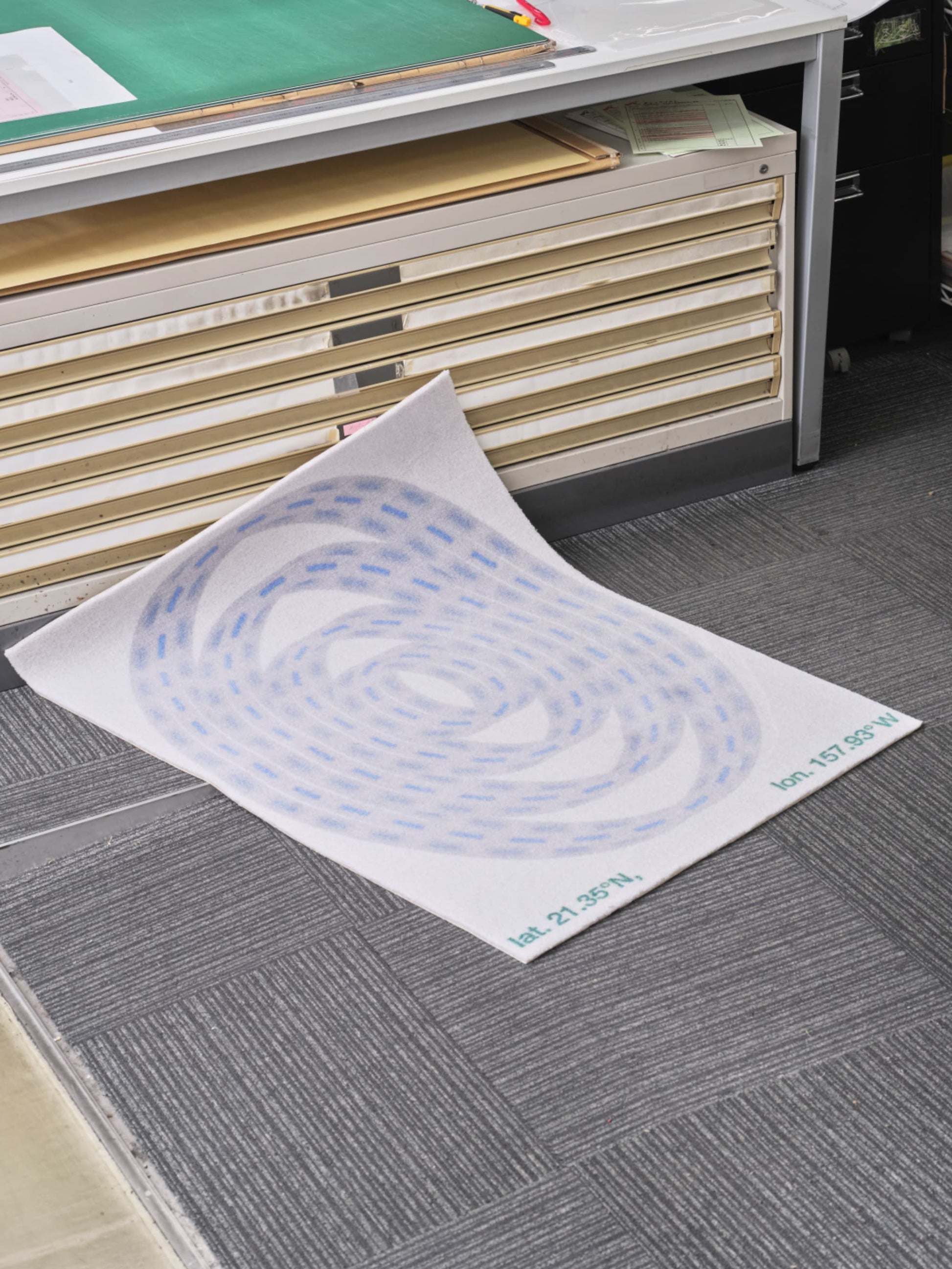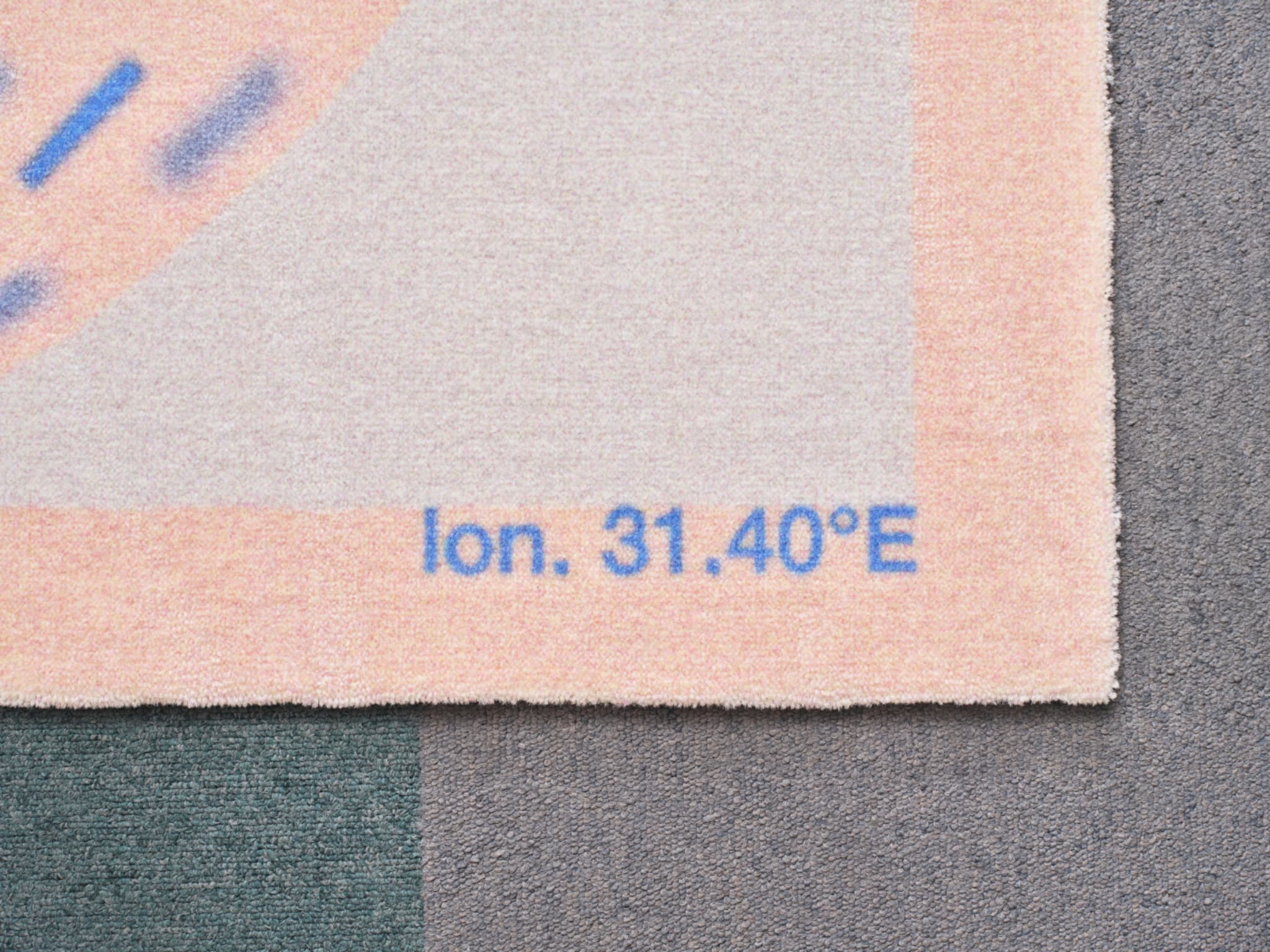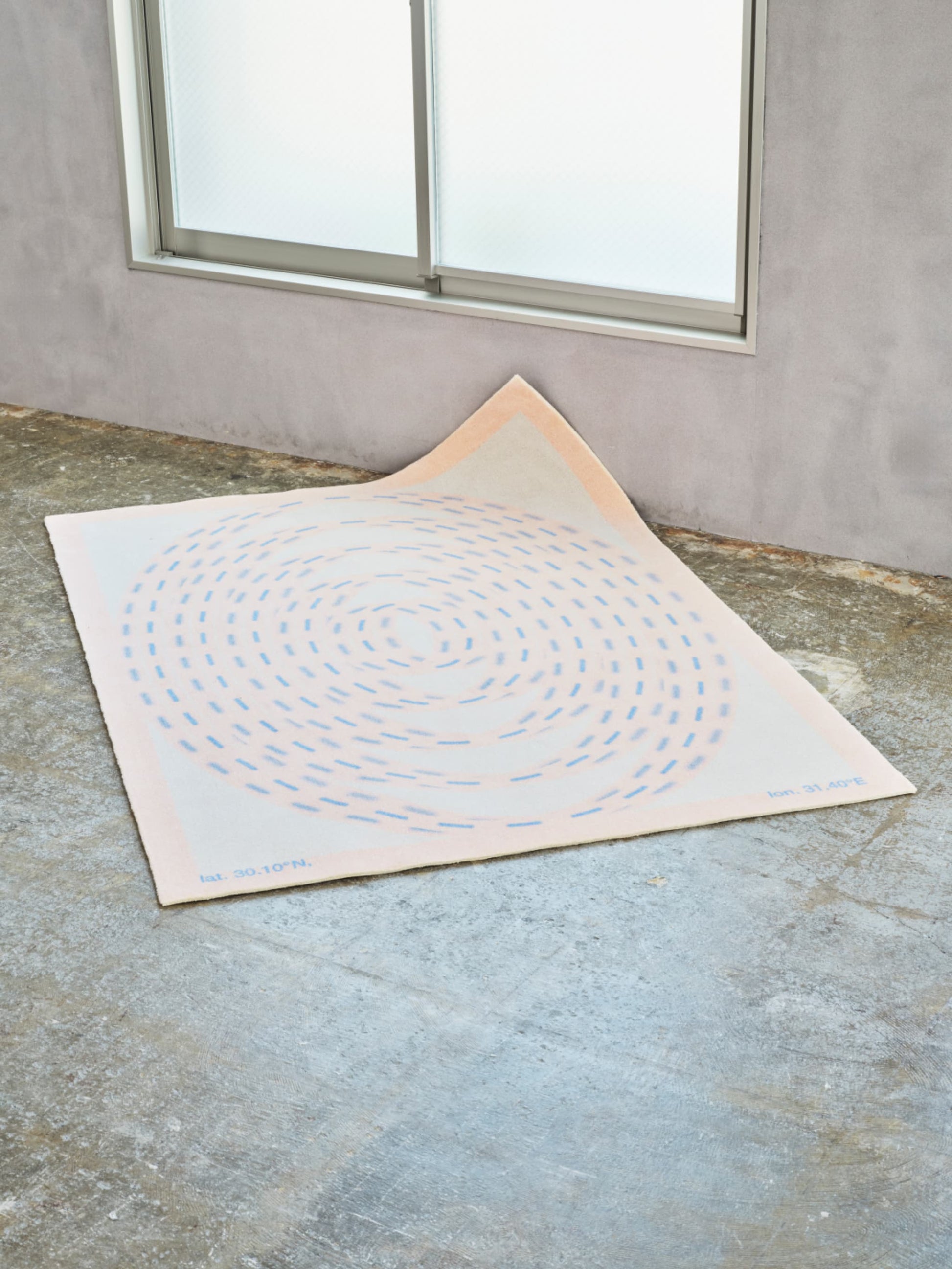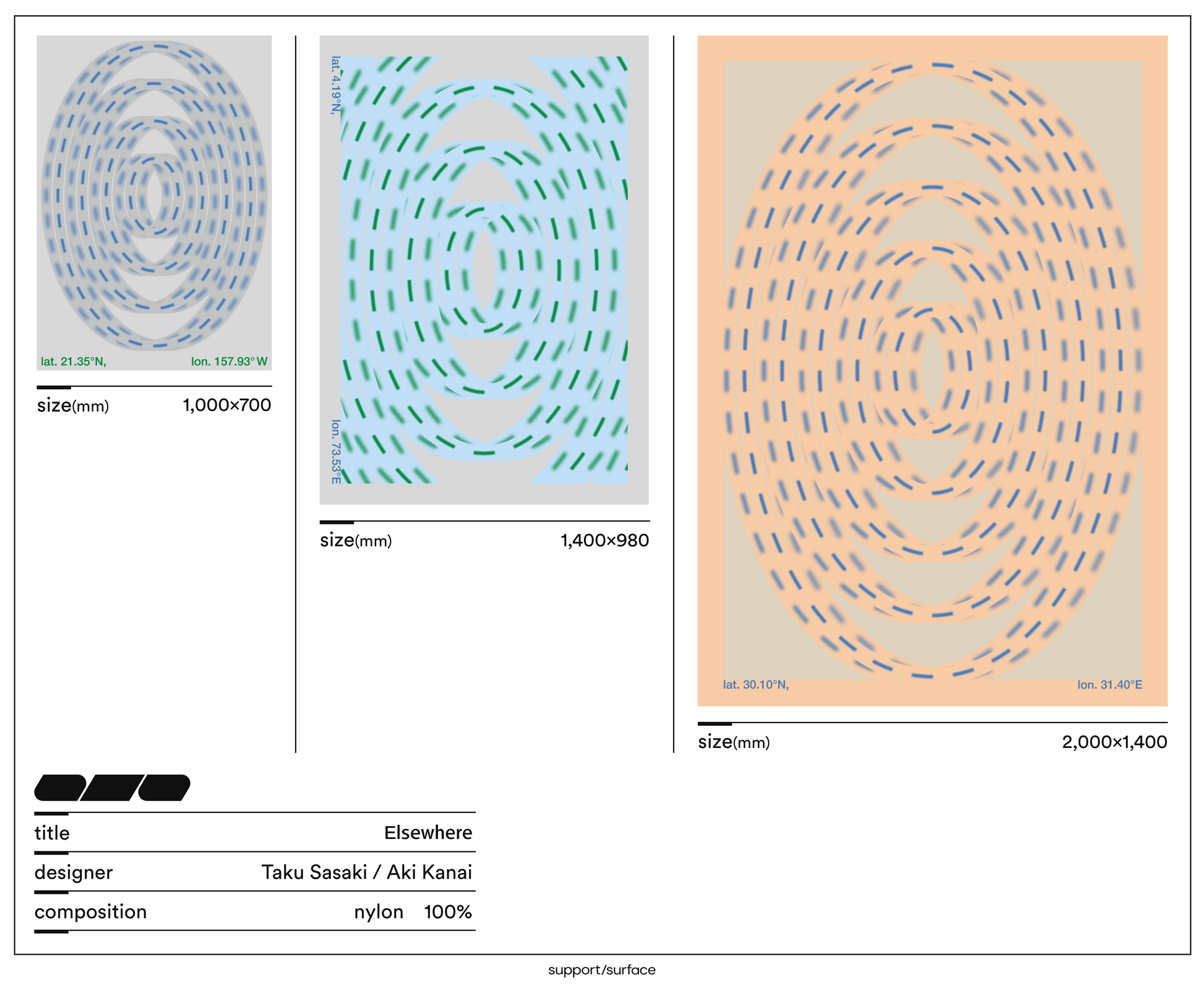そんな思いからすぐに行けたら嬉しい3か所を挙げ、3サイズのラグにワープリングをあしらい、アースカラーに寄せた組み合わせにしています。各場所の地球上の位置を示す座標を記すことで行き先を明らかにしています。